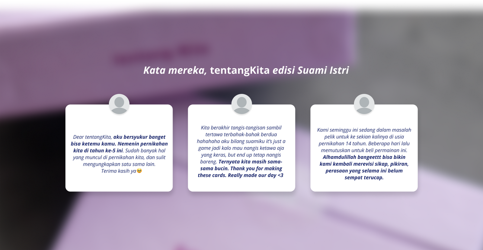 Selamat bermain untuk saling mengenal, mendekatkan diri, dan menelusuri tentang Suami Istri.