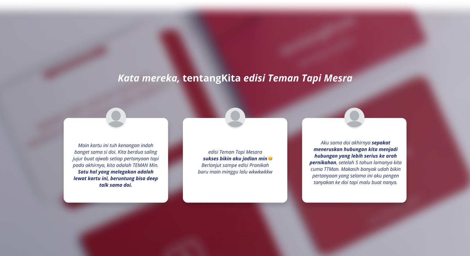 Selamat bermain untuk saling mengenal, memperjelas hubungan, dan menelusuri tentang Teman Tapi Mesra.